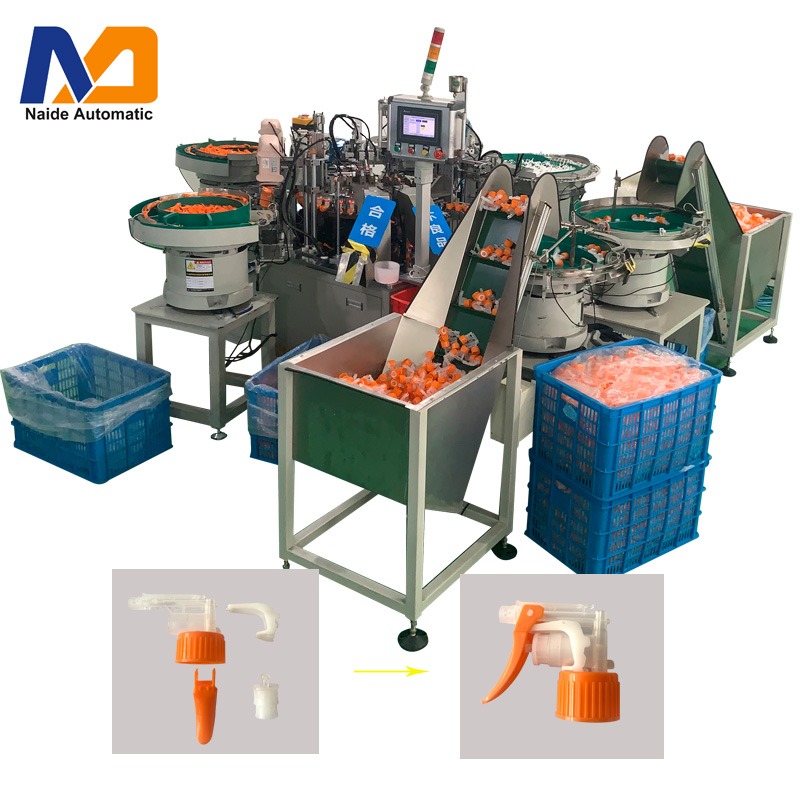 設備是主要針對噴霧器行業開發制造的全塑槍噴霧泵頭的組裝。該設備主要是為全塑方槍的塑料彈簧、活塞組件、扳手、槍體4件全自動組裝機。全套全塑方槍共計有5套自動化組裝設備。目前產能可做到一分鐘60-90個,操作遠遠比以前的設備簡單靈活。