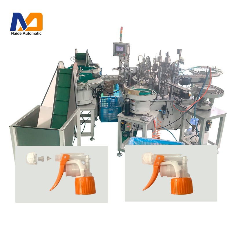 設備是主要針對噴霧器行業開發制造的全塑槍噴霧泵頭的組裝。該設備主要是為全塑槍引閥、分水頭、頭帽、槍體4件全自動組裝機。全套全塑方槍共計有5套自動化組裝。目前產能可做到一分鐘60-90個,操作遠遠比以前的設備簡單靈活。